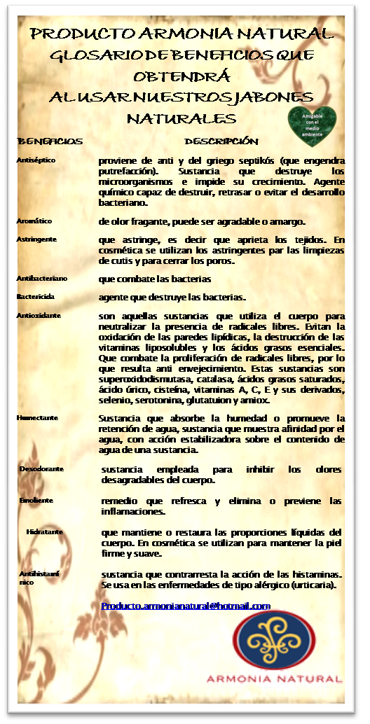 Hola a todos nuevamente, he decidido brindar esta información, debido a que hay algunos amigos que me han solicitado por medio de producto.armonianatural@hotmail.com ampliar sobre las propiedades de cada uno de los jabones por lo que creí importante agregarle al catálogo, un glosario que por el momento tiene pocas palabras, pero si creo importante brindarlas, después les agrego más. Y con mucho cariño para todas las personas que lo solicitaron espero que sea de mucha utilidad: