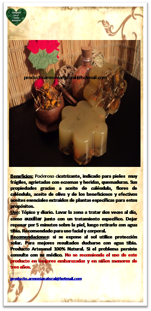 El jabón de glicerina de caléndula, es ideal para problemas de la piel, músculos o vasos sanguíneos, tales como heridas, inflamaciones, venas varicosas y muchas más que ampliaré después de la foto: