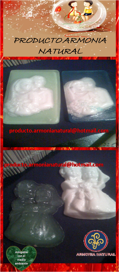 Jabones de glicerina con aroma y en varias técnicas : Los novios, corazones y rosas.......entre otros.